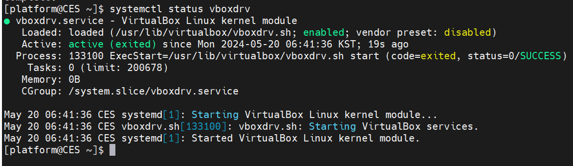 VirtualBox 설치가 성공했는지 확인하려면 다음 명령을 실행하여 vboxdrv 서비스의 상태를 확인