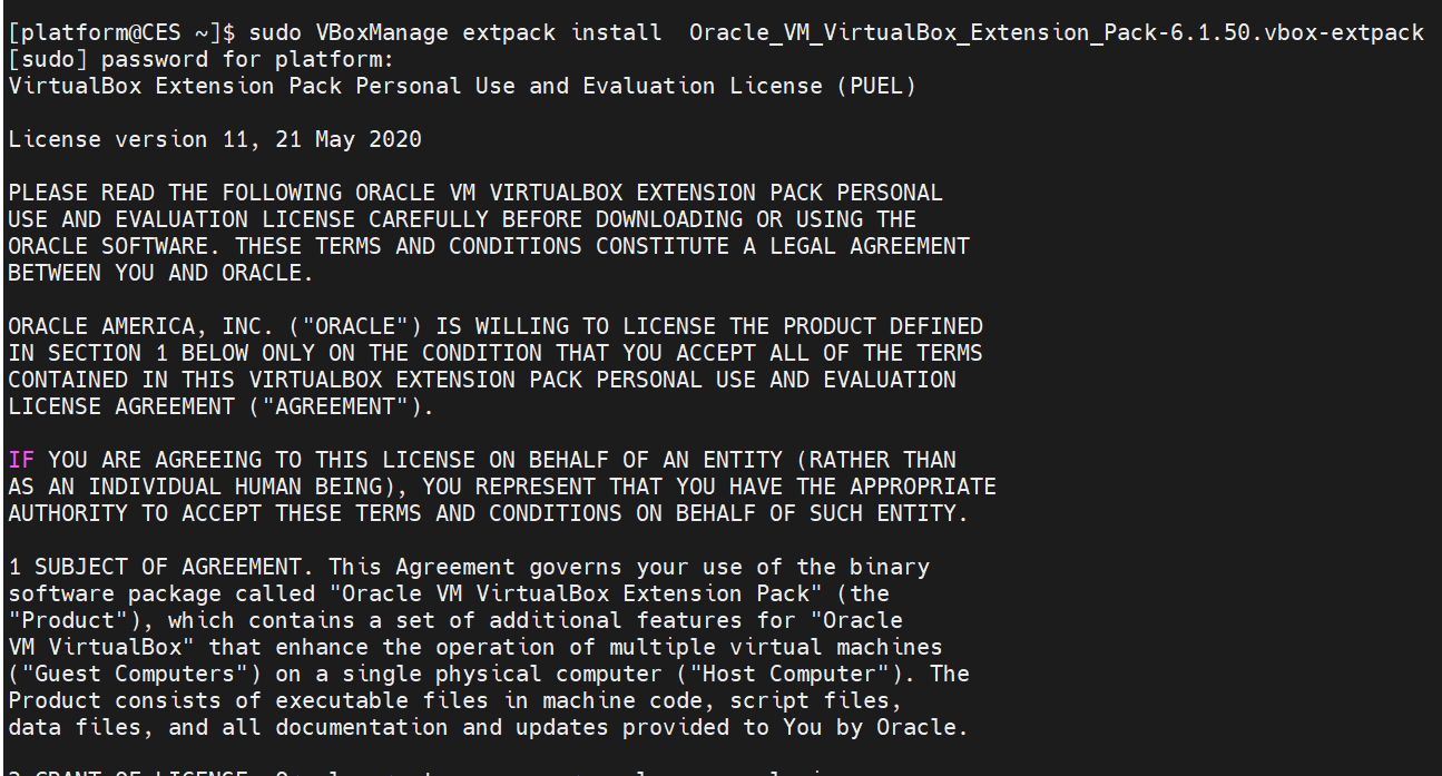 sudo VBoxManage extpack install Oracle_VM_VirtualBox_Extension_Pack-6.1.50.vbox-extpack