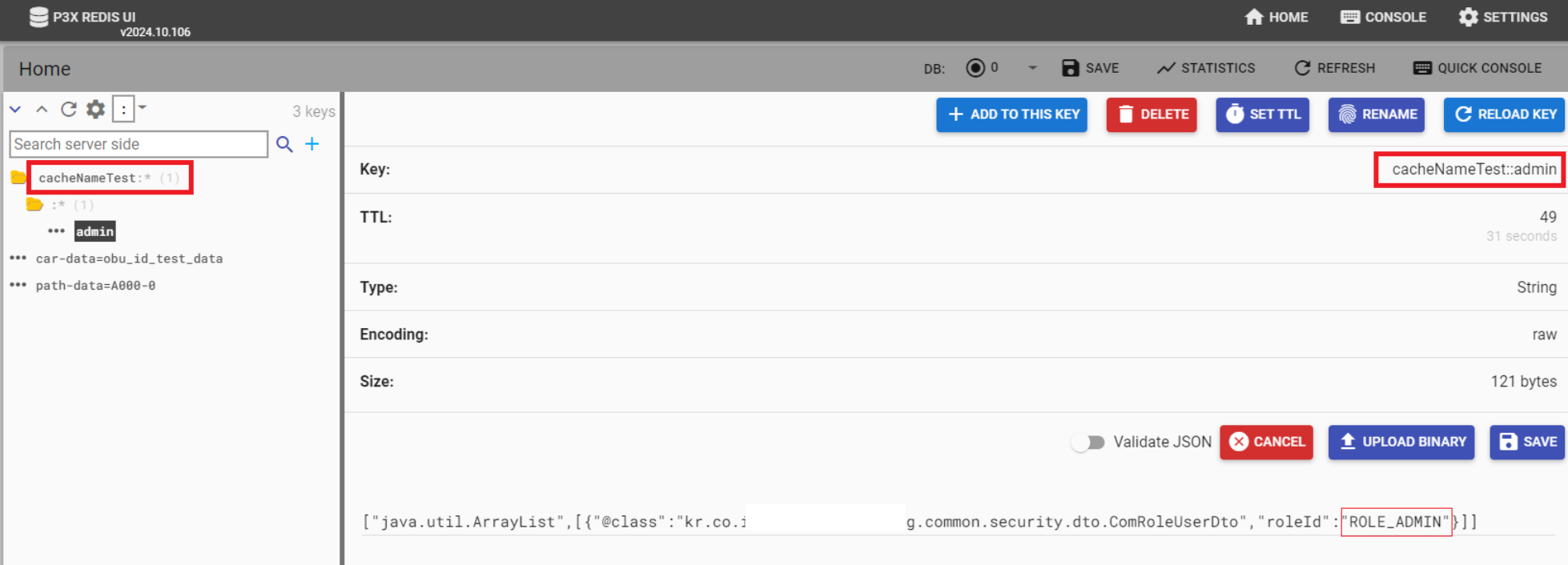 레디스 UI 에서도 cachNameTest 란 Key 값으로 캐시가 저장된 것을 확인할 수 있다.