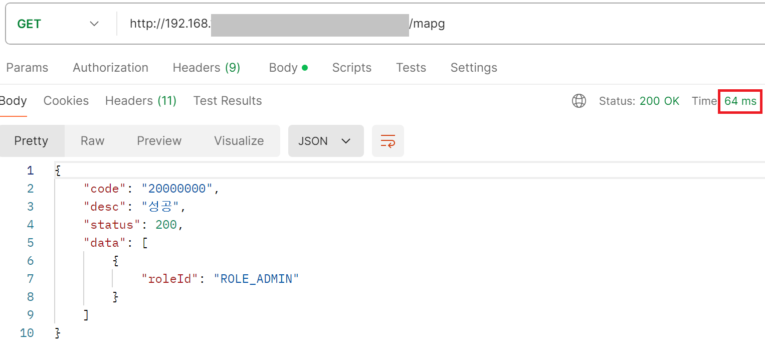 호출을 하면 64초 정도가 나온다. 여러번 호출해봐도 비슷하다.