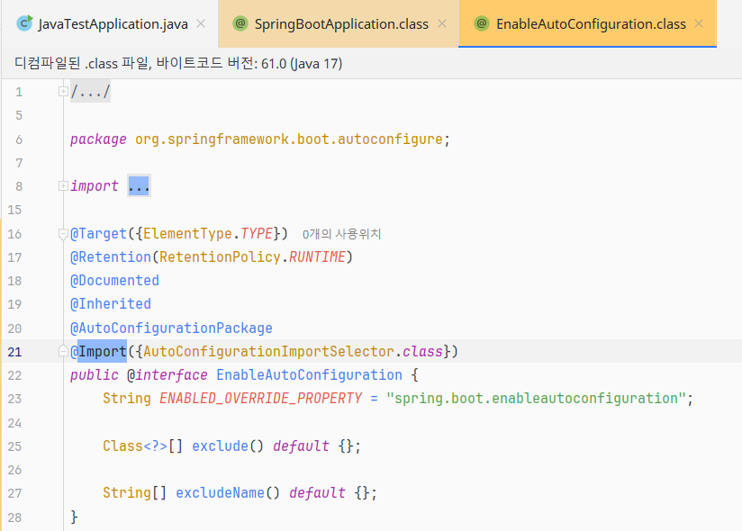 이 AutoConfigurationImportSelector를 스프링부트는 @Import 어노테이션으로 주입하고 있었던 것이다.