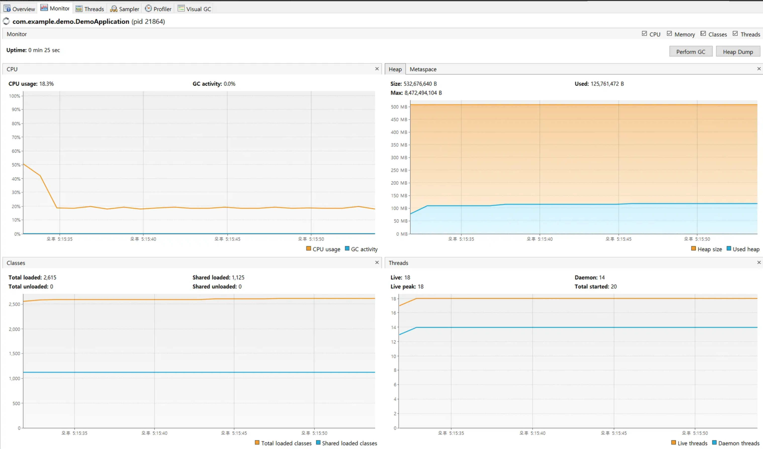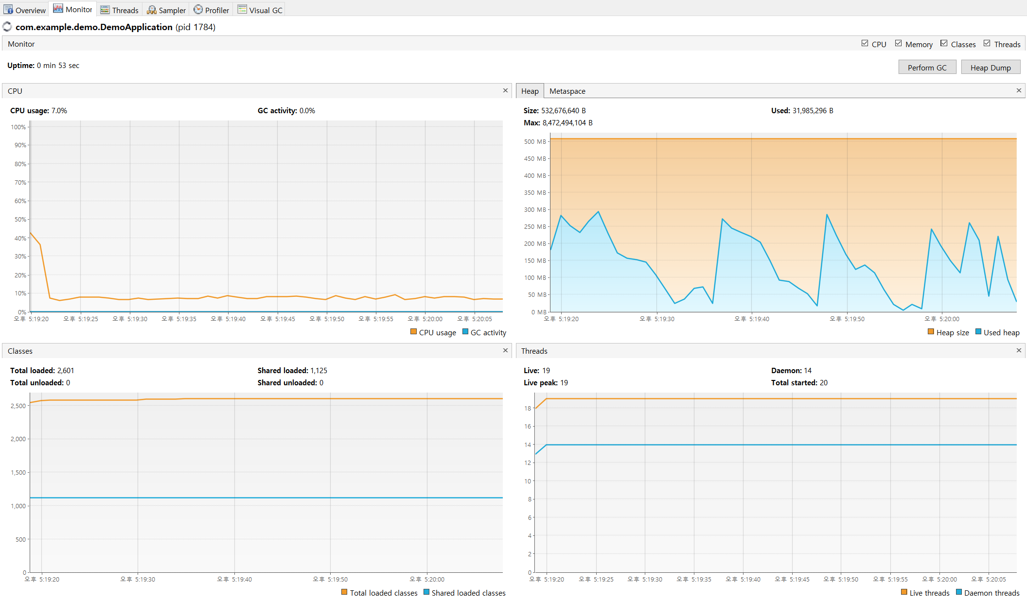 상단 좌측에는 CPU 모니터링, 상단 우측에는 메모리 (Heap) 모니터링이다.