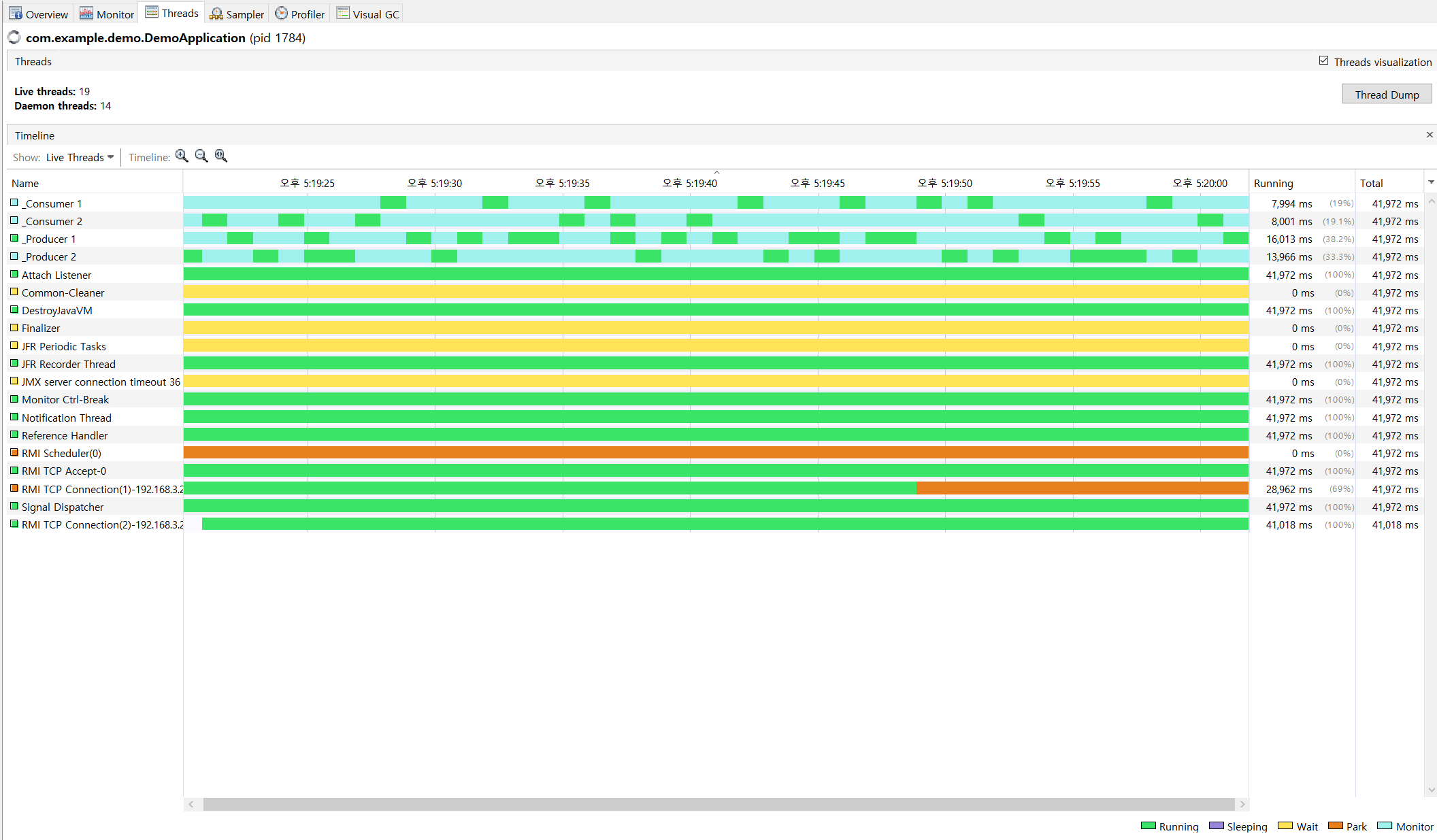 스레드 4개가 생성이 되었으나 하나(_Consumer 2)가 죽어버렸다. 경쟁 상태로 예외가 발생해서 죽어버린 것.