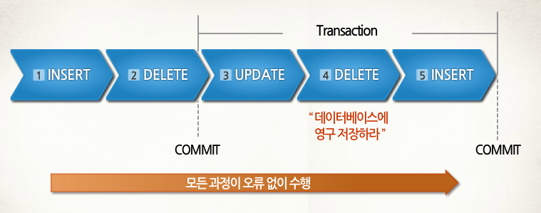 - 만약, 모두가 완전이 수행되지 않고, 어느 한 문장이라도 에러가 발생한다면, 트랜잭 묶인 전체 명령문은 모두 취소가 된다.