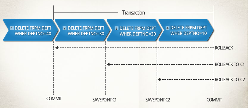 첫번째 COMMIT과 두번째 COMMIT사이(2, 3, 4번의 SQL문)가 한 트랜젝션이다. 한 트랜젝션 중간 중간에 SAVEPOINT를 두어 SAVEPOINT를 지정한 위치로 ROLLBACK가 가능하다.