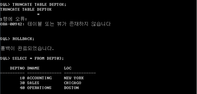 - 예 3) TRUNCATE문을 실행시키되 테이블명을 일부러 잘못 적어서 에러를 유도한 후, ROLLBACK명령문을 수행