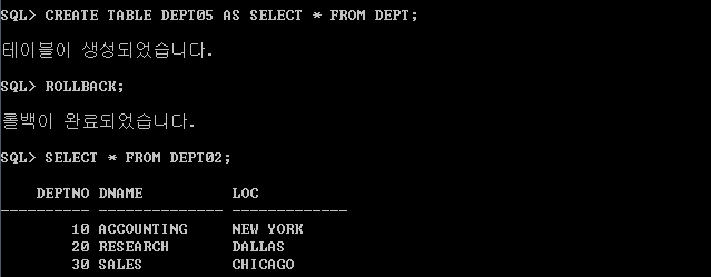 ROLLBACK 명령을 수행하였지만, DELETE된 정보가 되살아나지 않는 이유는 CREATE 명령문이 수행되면서 자동으로 COMMIT이 되었기 때문이다.