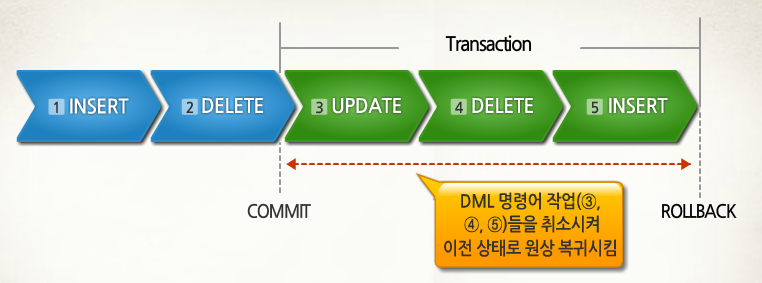 - COMMIT 수행하면, 하나의 트랜젝션 과정을 종료하게 된다.
